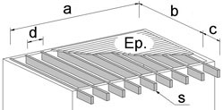 Largeur a, portée b, porte-à-faux c, entraxe d des gîtes